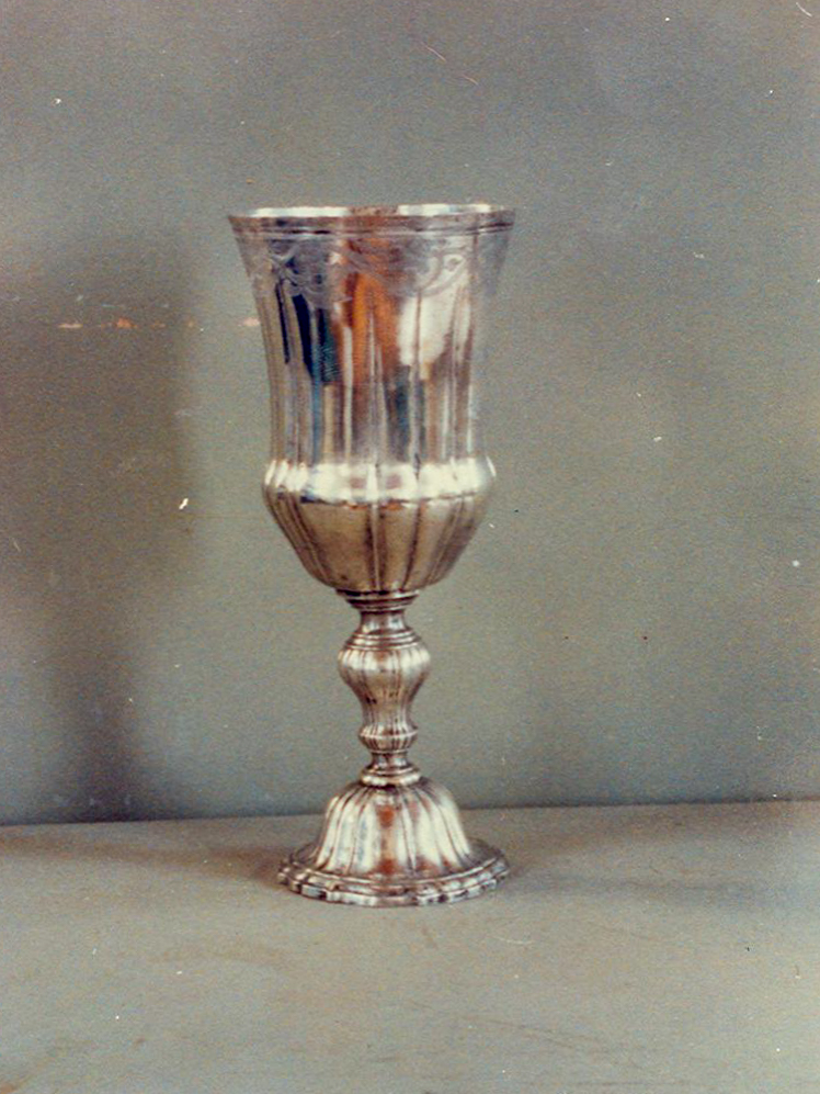 MuseuRegional_caliceA_foto Baixar TítuloCáliceDescriçãoApresenta na borda decoração incavo com motivos fitomorfos. Recipiente dividido em gomos. Pé piriforme invertido. Base campanular com borda sinuosa.ClassificaçãoObjetos rituais e cerimoniais de cultos específicosMaterialPrataTécnicaCinzelado | MarteladoDimensão (cm)26.7 x 12.2Localização geográficaSudeste > Minas Gerais > Campanha > Museu Regional do Sul de MinasData da ocorrência06/03/1994SituaçãoNão localizado