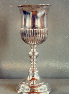 W99D8UzMAzow Baixar MuseuRegional_caliceB_foto1 TítuloCáliceDescriçãoApresenta na borda faixas entalhadas. Parte inferior do bojo gomada. Pé piriforme invertido; base campanular apresenta faixa com motivos fitomorfos. Na borda da base há marcas do prateiro. Procedência: Museu Regional do Sul de Minas.ClassificaçãoObjetos rituais e cerimoniais de cultos específicosMaterialPrataTécnicaMartelado | Prata cinzeladaDimensão (cm)34.7 x 19.5 x 13.8Observação da dimensãoDiâmetro da boca: 13,8 cm. Diâmetro da base: 12,3 cm.Localização geográficaSudeste > Minas Gerais > Campanha > Museu Regional do Sul de MinasData da ocorrência06/03/1994SituaçãoNão localizado