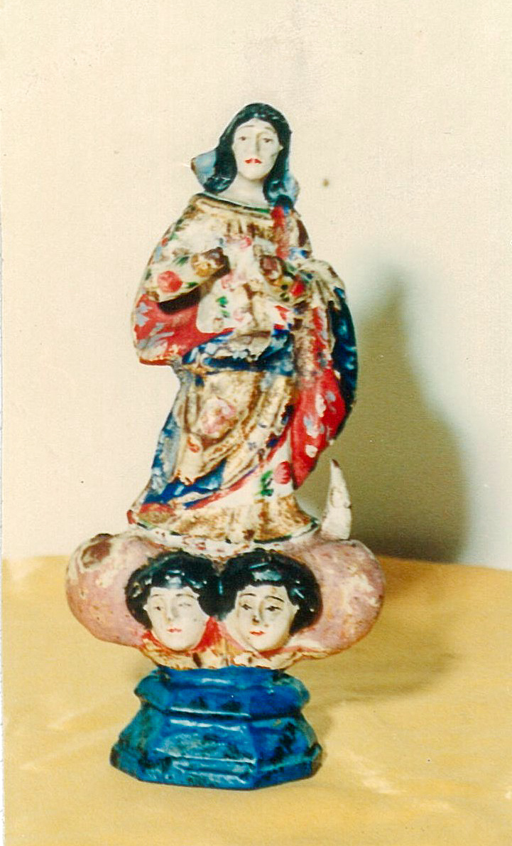 Figura feminina; adulta; posição em pé frontal; braços flexionados para frente; mãos postas sobre o peito, em uma das mãos apresenta um dedo quebrado; as vestes são compostas por túnica longa com desenhos de figuras fitomorfas; manto também com figuras fitomorfas, com detalhes de azul e vermelho envolto ao redor do corpo. A imagem está apoiada sobre peanha azul superposta de nuvens com dois querubins, apresenta lua em somente um lado, sendo no lado oposto a inclinação da cabeça falta um corno da lua. Possui entre 15 a 16 cm de altura.