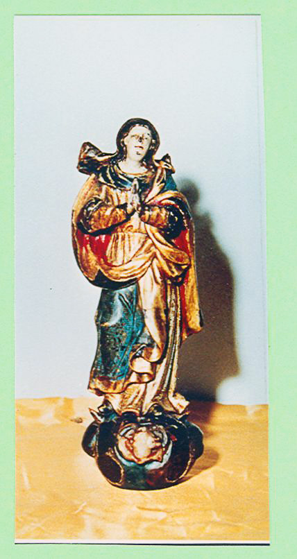 MuseuArteSacra_NSraConceicaoA_foto1 Baixar TítuloNossa Senhora da ConceiçãoDescriçãoFigura feminina, jovem, posição frontal, braços flexionados para frente, mãos postas, veste túnica longa, manto envolto no corpo, preso no braço esquerdo, pés calçados. Peanha com querubim de calcita incrustado. Possui entre 22 a 25 cm de altura.DenominaçãoEscultura ReligiosaClassificaçãoEscultura religiosaMaterialMadeiraTécnicaPolicromiaData ou períodoSéculos XVIII / XIXLocalização geográficaSudeste > Minas Gerais > Oliveira > Museu Diocesano Dom José Medeiros LeiteData da ocorrência25/07/1994SituaçãoNão localizado