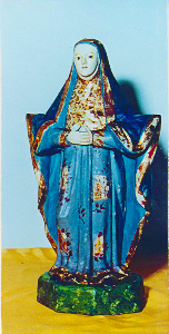 Imagem feminina, jovem, posição frontal. Possui policromia predominante em tons de azul, sobre a cabeça um manto que se estende até a base. Esse apresenta "peitilho" dourado com motivos fitomorfos. Braços flexionados ao centro da imagem com mãos superpostas sobre o peito. Peanha na cor verde. Possui entre 23 a 26 cm de altura. A imagem possuía resplendor de prata.