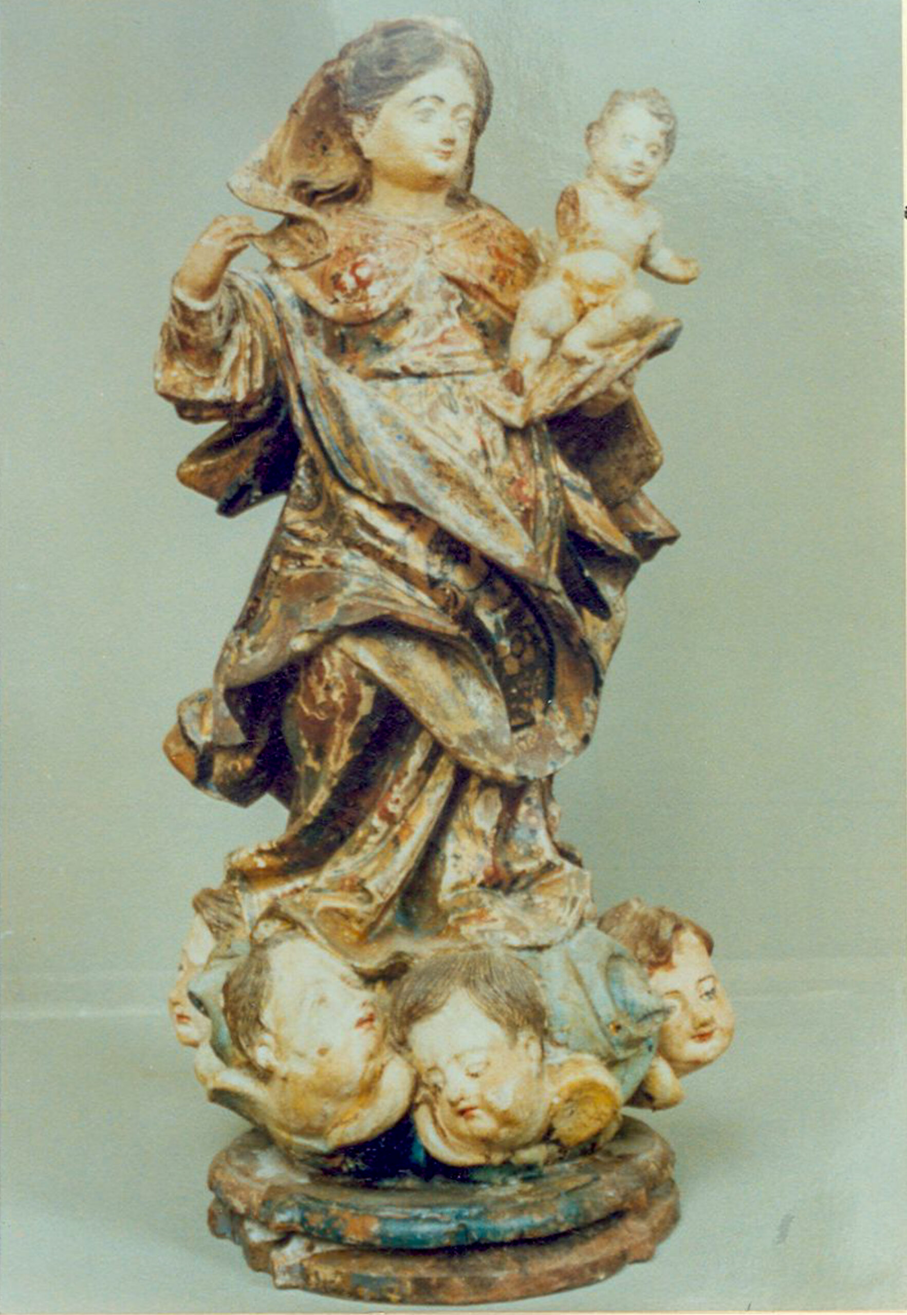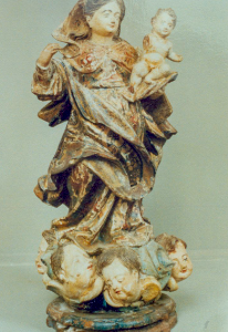 Figura feminina em pé trajando véu sobre cabelos longos, manto e túnica com forte panejamento em tons de ocre, dourado, preto, verde e vermelho. O braço direito está semifletido à frente, com a mão esquerda está a ponta do manto e sobre esta, a imagem de menino nu. A perna direita está semifletida sob as vestes. Imagem sobre volutas em tons de azul representando nuvens onde vê-se quatro cabeças aladas. Base oval chanfrada em tons de ocre e azul.