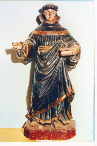 Figura masculina de pé. Cabeça voltada para frente, apresenta tonsura, é imberbe. Olhos amendoados, nariz fino, boca saliente. Imagem veste hábito da ordem franciscana. Hábito cinturado com cordão nodal, braço direito flexionado para frente, braço esquerdo flexionado, rente ao corpo, mão esquerda segura livro com as pontas dos dedos. Pés à mostra. Peça com pequenas lacunas na policromia, carnação e douramento. Perda dos atributos.