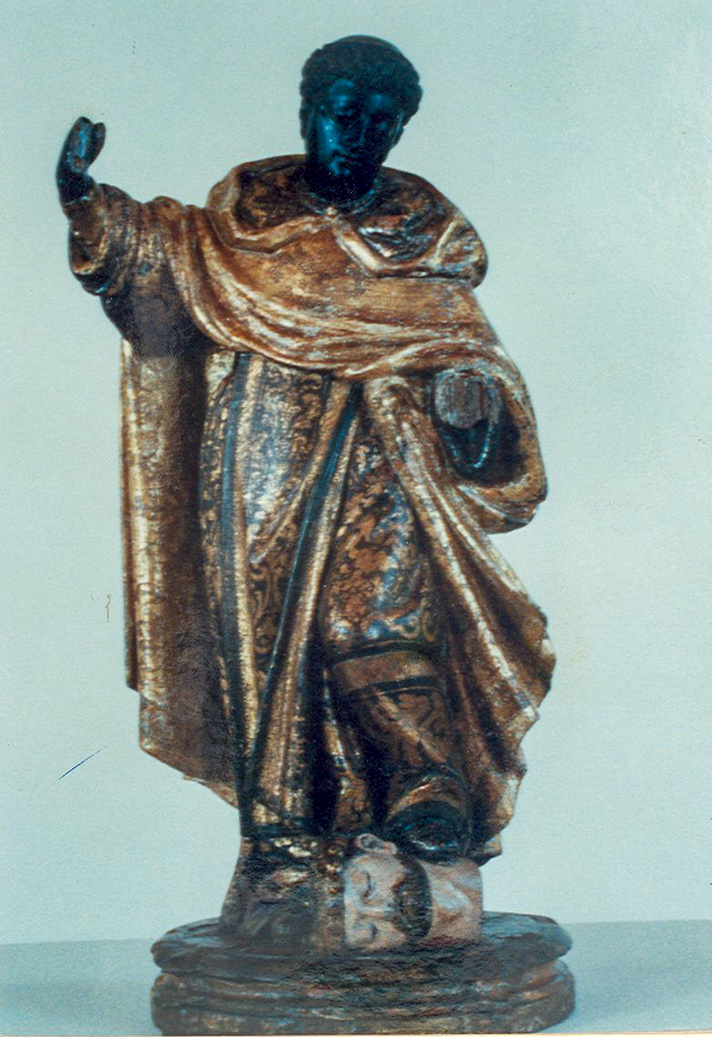 Figura masculina com a carnação escura, cabeça levemente inclinada à sua esquerda, tossurada. Traja manto em tons de ocre e dourado, túnica e escapulário em tons de marrom e dourado. Seu braço direito suspenso e esquerdo fletido, sua perna esquerda semifletida tendo o pé apoiado sobre pescoço de cabeça masculina coroada, figura barbada. Base elíptica sinuosa.