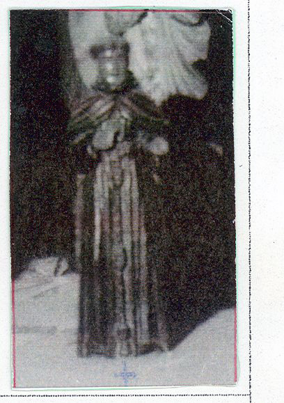 Figura masculina de pé, em posição frontal, tonsura na cabeça; cabeça de marfim direcionada para frente, braços flexionados à frente do corpo, mãos abertas sem policromia, veste hábito franciscano cintado com um cordão nodal. Falta peanha e uma das mãos. Possui entre 15 a 23 cm de altura.