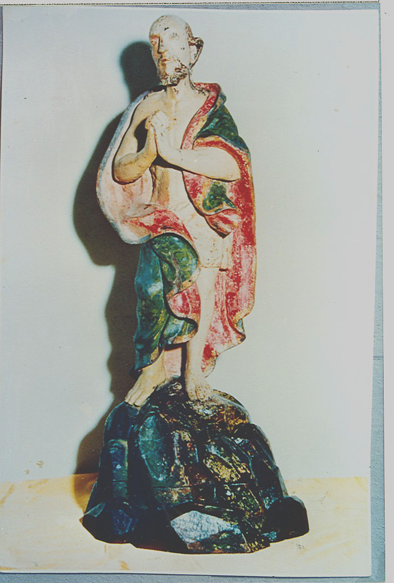 Figura masculina de pé, em posição frontal, com a cabeça ligeiramente inclinada para direita, com barba e bigode, braços flexionados à frente do corpo, mãos postas com os dedos entrelaçados, pernas entreabertas com os pés em ângulo. Veste perizônio e manto sobre as costas, cobrindo toda a perna direita, descendo até o tornozelo direito e preso por baixo do braço esquerdo, pés descalços apoiados sobre peanha trabalhada em chanfros irregulares e com a parte superior arredondada. Possui entre 30 a 39 cm de altura. A imagem foi restaurada no século XVIII.