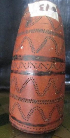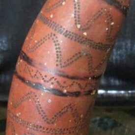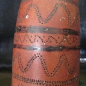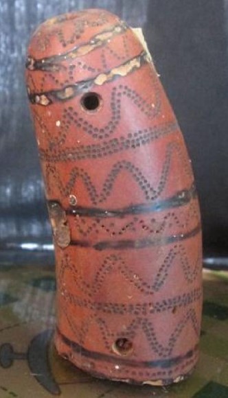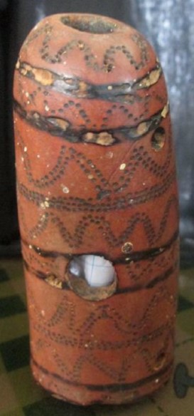 Madeira, d.C 1,476 – d.C 1,532, instrumento aerofone em formato cilíndrico com desenhos em zig zag intercalado por linhas.