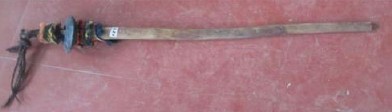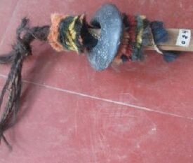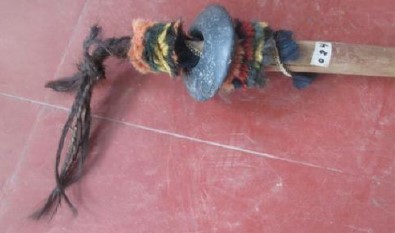 Lítico, madeira, fibra de camelídeo e cabelo, período indeterminado, cacetete em formato de disco com cabo de madeira, apresenta ornamentos em cores verde, azul, amarela e laranja terminando em cinco tranças de cabelo.