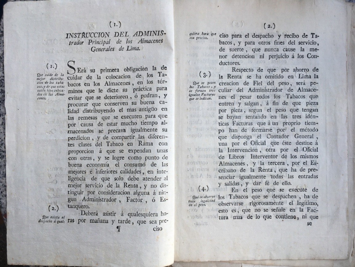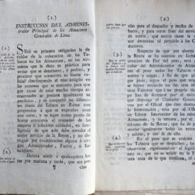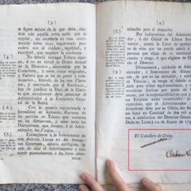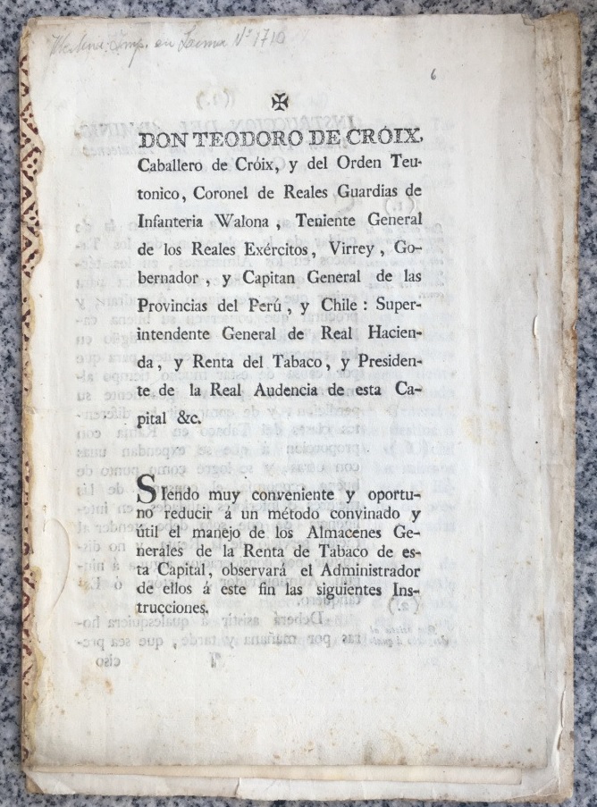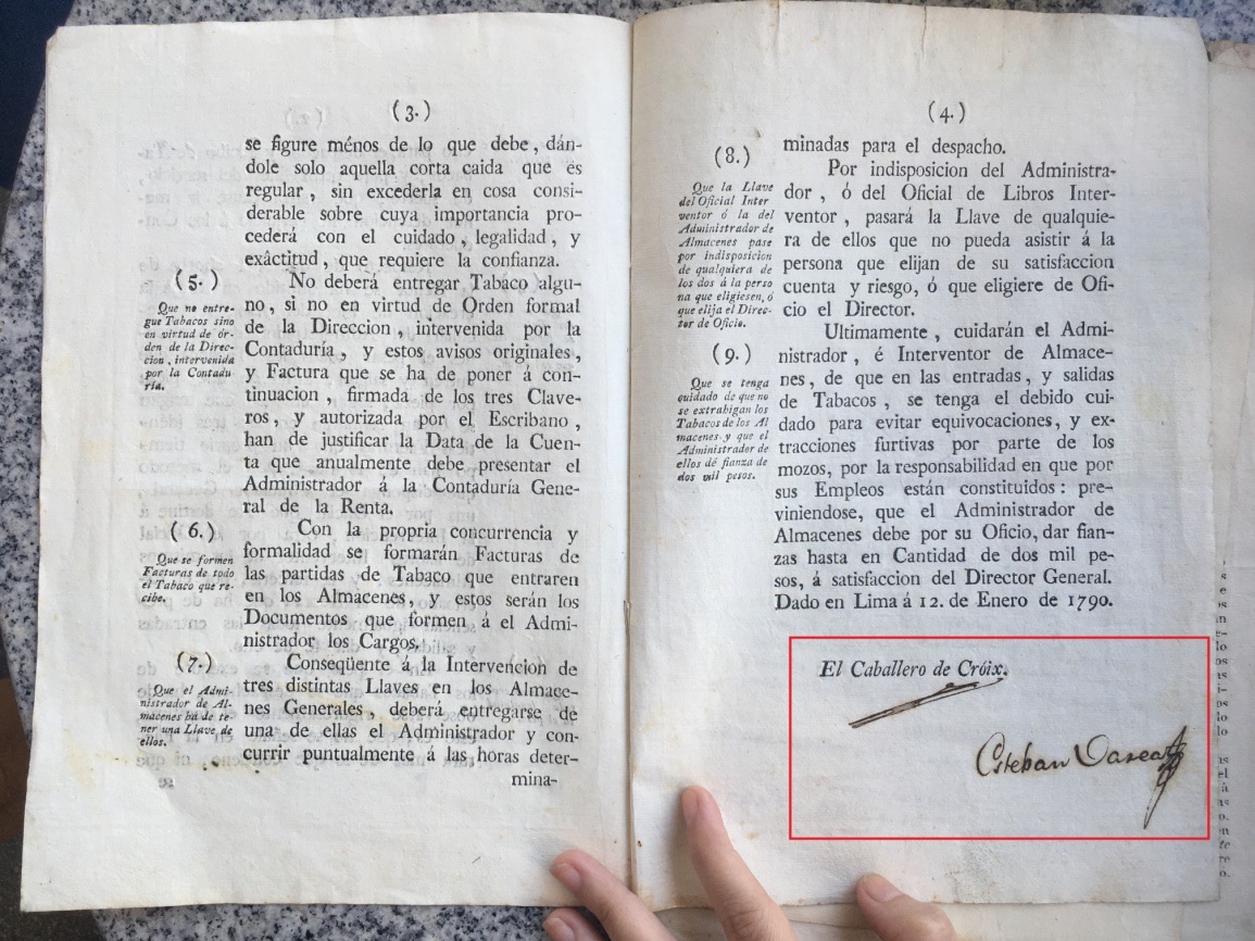 Impressão e assinatura manuscrita, 1790, instruções do Vice Rei Teodoro de Croix para a gestão de armazéns em Lima, relacionados à renda de tabaco, assinado pelo Vice Rei e pelo Secretário da Câmara Esteban de Varea.