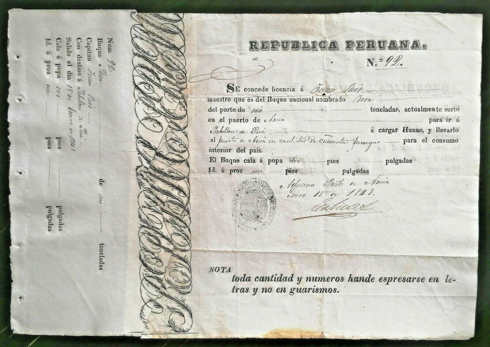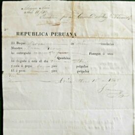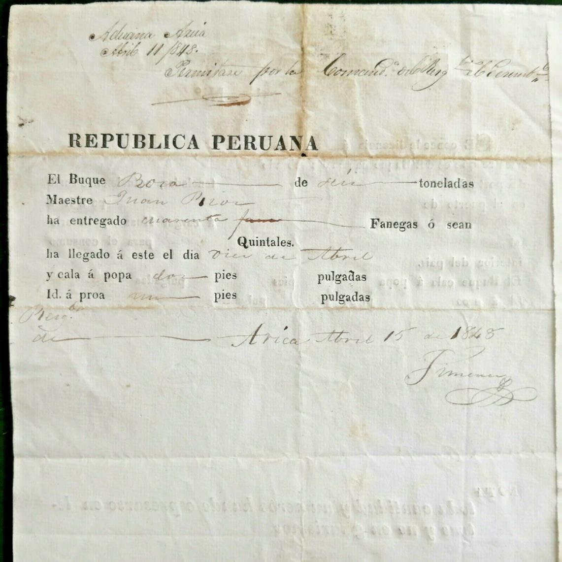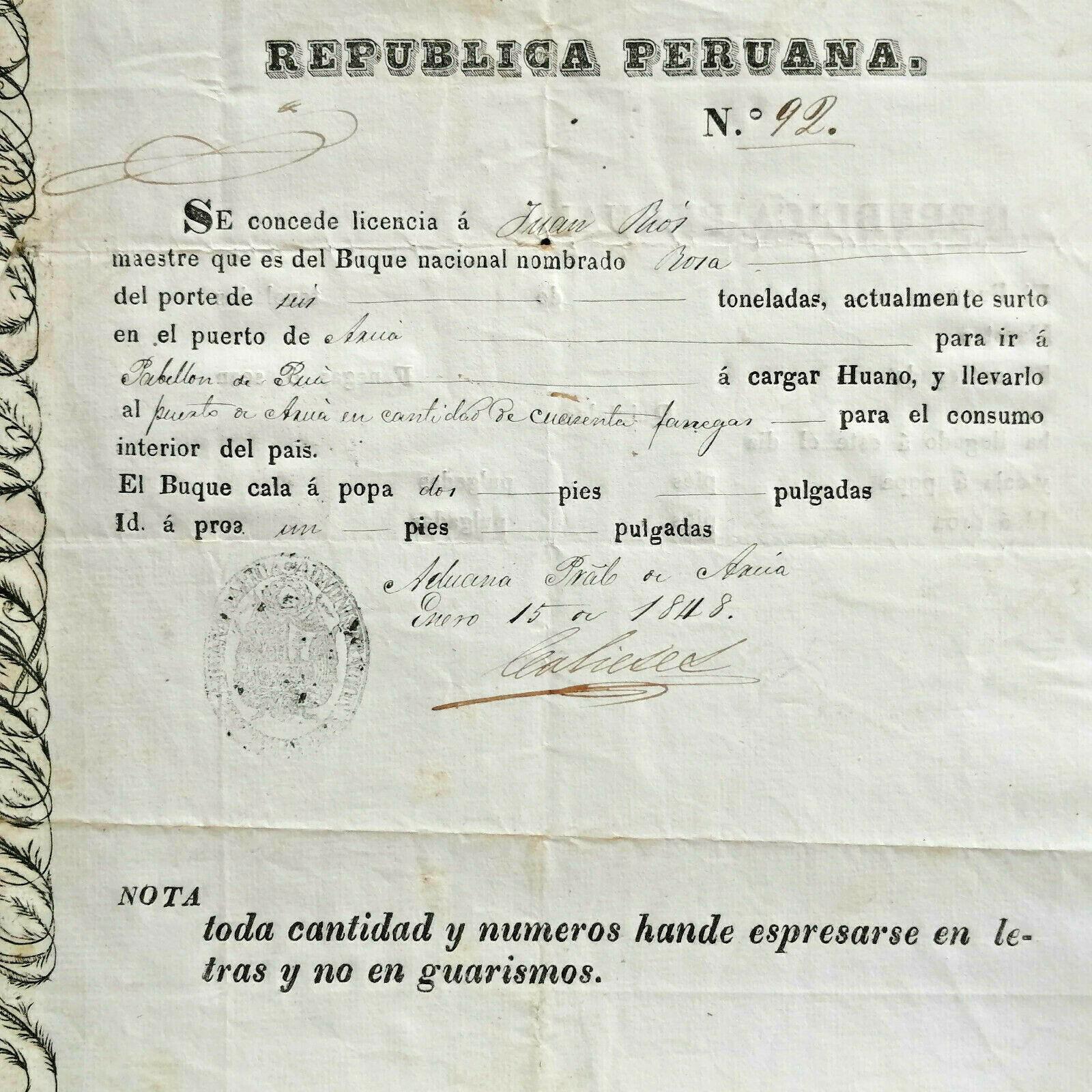 Anexo E-mail – 05-07-2022 – Foto – 1 Baixar Anexo E-mail - 05-07-2022 - Foto - 2 Anexo E-mail - 05-07-2022 - Foto - 3 Anexo E-mail - 05-07-2022 - Foto - 4 TítuloDocumentoDescriçãoImpressão e Manuscrito, 1848, licença de navegação concedida ao Capitão Juan Ríos para o transporte de guano.Alerta314-2022Data1848PaísPeruLocalCorreios e Telégrafos de Lima, Arquivo Geral da Nação (Lima)CategoriaArquivísticoTipologia do bem culturalDocumento de comércio (Licença de navegação)