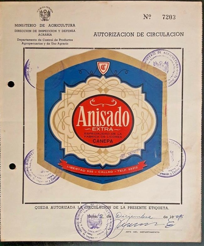 Manuscrito e impressão, 1965, nº 7203, autorização de circulação para a Fábrica de Licores de Canela expedida pelo Ministério da Agricultura - Direção de Inspeção e Defesa Agrária - Departamento de Controle de Produtos Agropecuários e de uso agrário; Anisado - Extra.