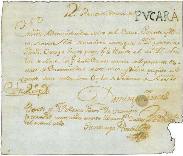Manuscrito, 1797, em que Domingo de Abarca da Administração dos Correios de Pucará ordena a entrega de 20 pesos à María Francisca Ocampo, enviado pelo advogado Nicolás de Arce; e recibo outorgado por Santiago del Portillo recebendo tais pesos. Apresenta estado regular de conservação com manchas na borda inferior.