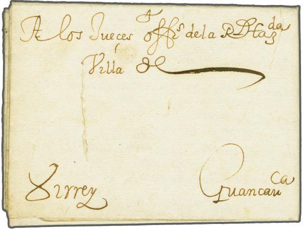 Manuscrito, 1650, correspondência do Vice-Rei aos funcionários reais de Huancavelica. Carta do Vice-Rei do Peru García Sarmiento de Sotomayor, Conde de Salvatierra aos Juízes Oficiais da Receita de Huancavelica. O conteúdo expressa a responsabilidade dos Funcionários da Fazenda para as minas de mercúrio e a substituição dos recipientes do metal destinado para obtenção de Prata pela pessoa responsável, para Potosí. Estado de conservação regular, apresenta rasgo.