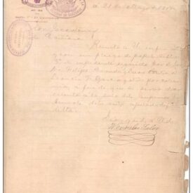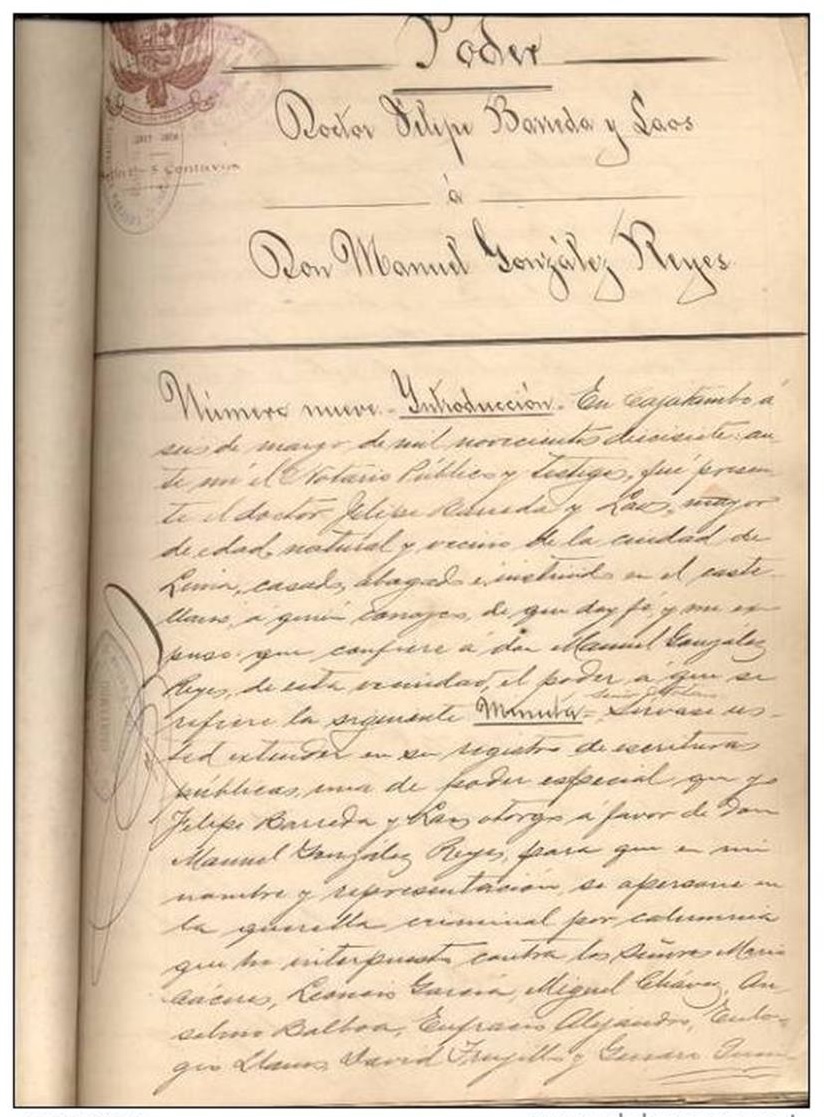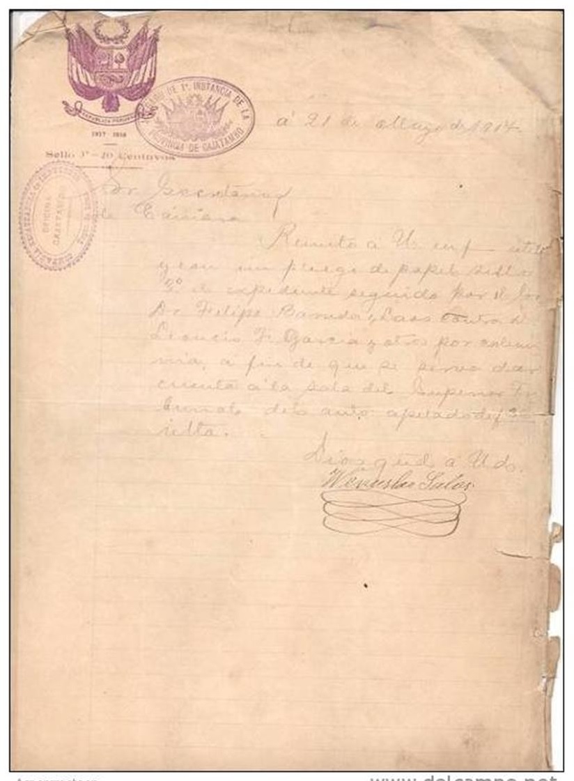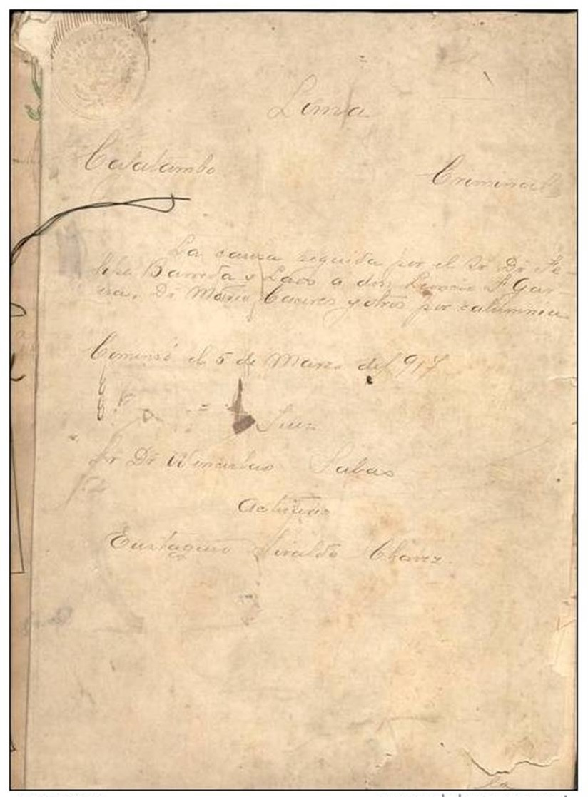 Manuscrito e impressão, 1917. Documento judicial de um processo de calúnia, feito em Cajatambo, possivelmente fora para alta instância de Lima. As pessoas sinalizadas são: o Juíz de Primeira Instância Wenceslao Salas, o autor Felipe Barreda y Laos, contra Mario Cáceres, Leoncio Gracia, Miguel Chávez, Anselmo Balboa, Eufracio Alejandro, Eulogio Llanos, David Trujillo e outros. República Peruana / 1917-1954. Assinado e rubricado pelo magistrado Juíz de Primeira Instância Dr. Wenceslao Salas. Estado regular de conservação com manchas de sujidade e umidade.