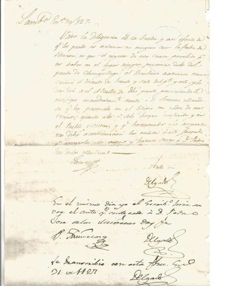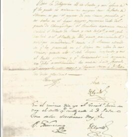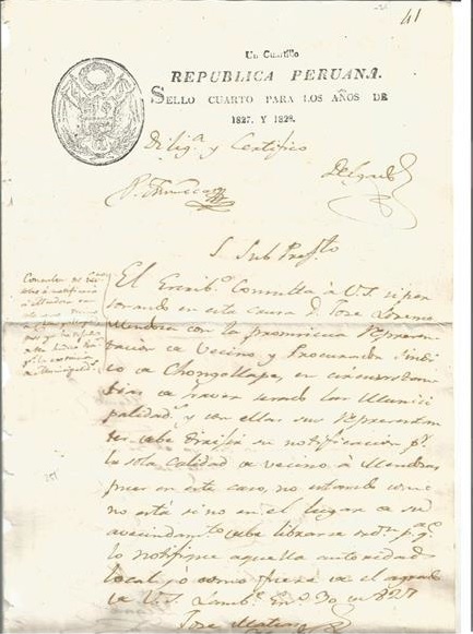 Manuscrito e impressão, 1827, com texto impresso "Um quarto / República Peruana / Quarto selo para os anos de 1827 e 1828" correspondência oficial em que o escrivão José Matías Delgado faz a consulta ao subprefeito de Lambayeque, o indicando sobre a possibilidade de envio de notificação a José Lorenzo Mendoza como cidadão ou Procurador do Distrito de Chongoyape, nos Municípios que foram extintos por causa de disputa dos moradores deste local. Assinado por Delgado em 30 de janeiro de 1827. Apresenta ainda transcrição do escrivão Sr Pedro José de las Muñecas em 31 de janeiro de 1827. Estado regular de conservação, com a presença de manchas leves de sujidade e de umidade.