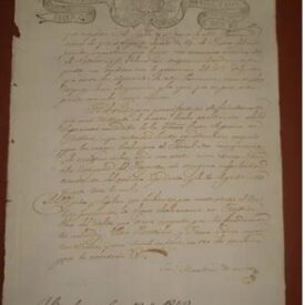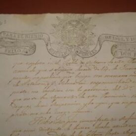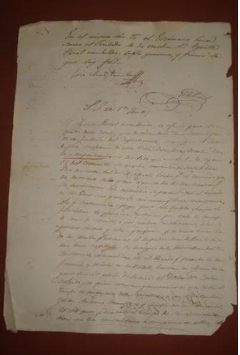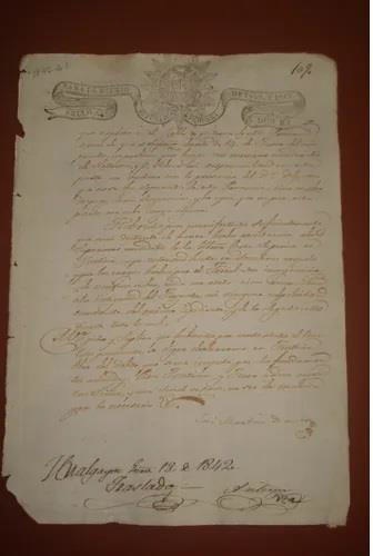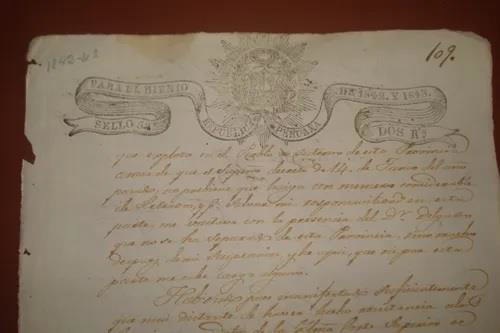 Manuscrito, 1842, fragmento. Processo judicial de Hualgayoc. No documento aparece "explode na cidade de Cutervo" como sendo algum mineral ou produto, assinalando também a visita do Dr Delgado, ao que se parece ser uma autoridade Hualgayoc. Aparece também "Cutervo não se separou desta província"; assinado em Hualgayoc em 13 de janeiro de 1842. Estado regular de conservação, com bordas irregulares, ruptura e rasgos, manchas entre outros.