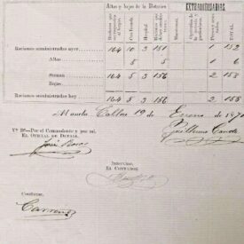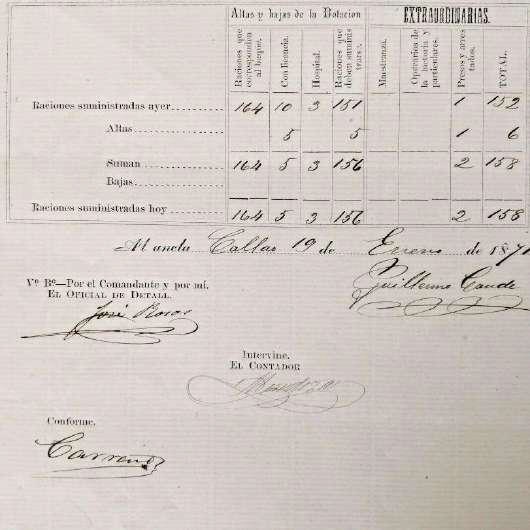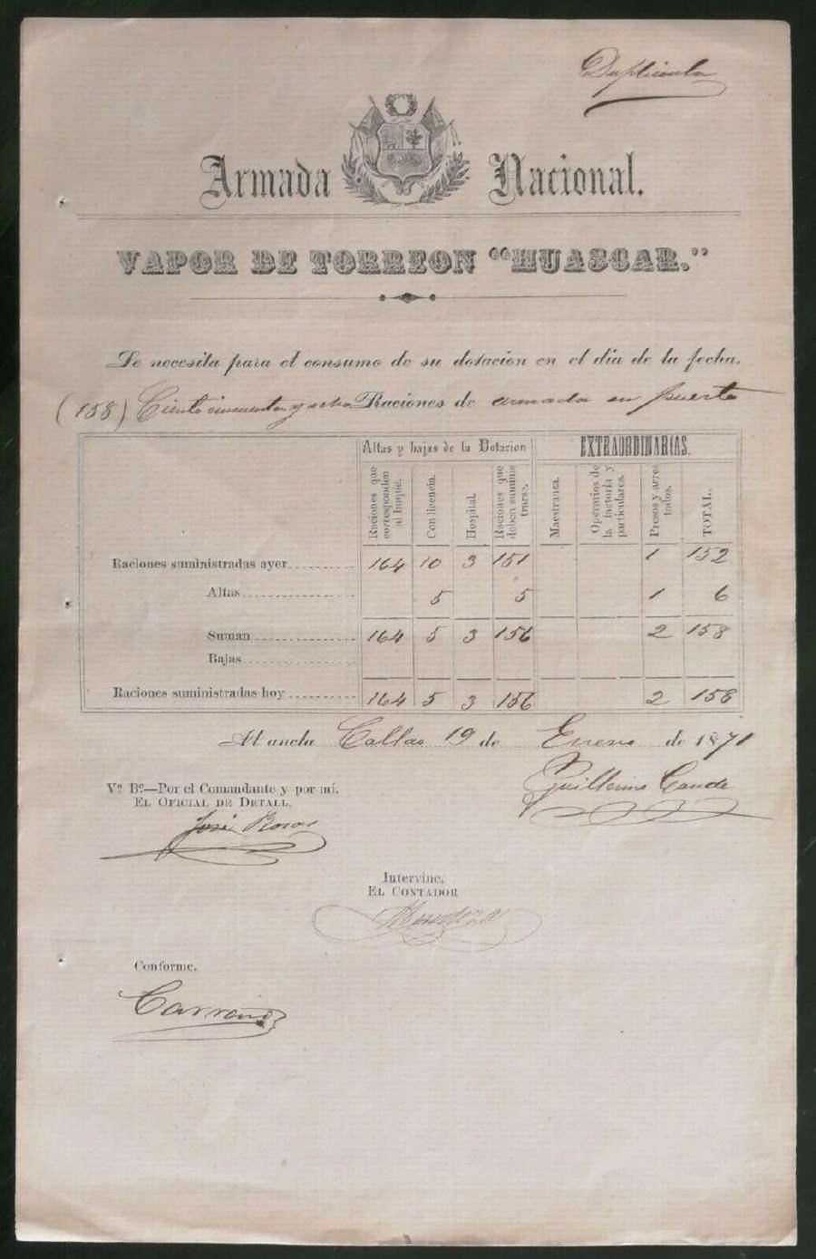 Manuscrito e impressão, 1871. Documento duplicata com a impressão da Marinha e Armas Nacionais. Pedido de suprimentos da Marinha para o vapor de torreão "Huáscar", de cento e cinquenta e oito rações no porto da Marinha. Assinado pelo Oficial Guillermo Conde e aprovado por José Rosas, contador de Mendoza, datado de 19 de janeiro de 1871, Callao. Estado regular de conservação, com vincos, rasgos e manchas nas bordas.